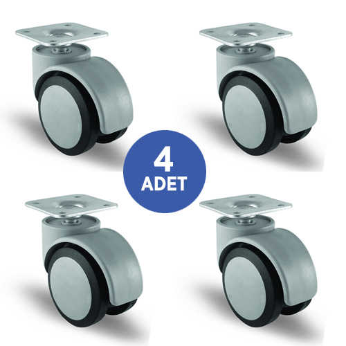 EC01 MKT 50 geniş tip, çift kasnaklı, döner tablalı, polipropilen (moblen), termoplastik kauçuk kaplı, gri renkli tekerlekli ürünümüzdür. Tekerleğin yataklaması burç ile sağlanmıştır. Tekerlek, civata ve somun aracılığıyla oynak tabladaki 4 deliğe bağlantı yapılarak yüzeye montaj gerçekleştirilir. Tekerlek, oynak maşası sayesinde 360 derece dönebilme kabiliyetine sahiptir. Tablalı bağlantı en çok tercih edilen bağlantı tipidir.