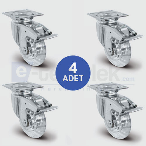 4 Adet EU01DKP50F Döner Tablalı Frenli Şeffaf Tekerlek Çap:50 Mobilya Tekerlek Seti Çift Dizi Burçlu 4xEU01DKP50F