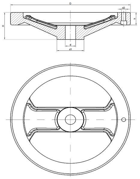 2 kollu, 125mm çapındaki volan üzerinde kol bağlamak M6 delik hazırlığı mevcuttur. Göbek çapı 31mm, çark komple yüksekliği 33mm olarak üretilmiştir.