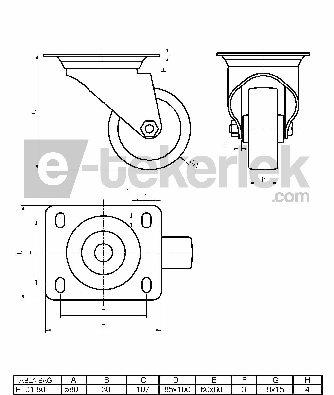 Eİ01 HKZ 80F kodlu ürünümüz döner tablalı, frenli, poliamid (polyamid) tekerlekli ürünümüzdür. Tekerleğin yataklaması burç ile sağlanmıştır. Tekerlek, civata ve somun aracılığıyla oynak tablaya bağlantı yapılarak yüzeye montaj gerçekleştirilir. Tekerlek, oynak maşası sayesinde 360 derece dönebilme kabiliyetine sahiptir. Kilit mekanizması aktive edildiğinde hem tekerleğin hem de oynak maşanın hareketini engelleyip kilitlenmesini sağlar. Bu sayede sistem güvenli şekilde hareketsiz kalır. Genellikle 4 tekerlekli bir uygulamada 2 tekerleğin frenli (kilitli) olması yeterlidir.