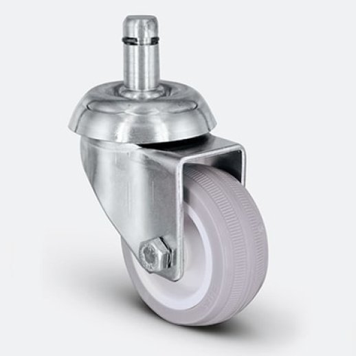 EP03 ZKC 50M11 kodlu ürünümüz döner tablalı, pim bağlantılı, poliamid kasnaklı ve PVC kaplamalı tekerleğimizdir. Tekerleğin yataklaması burç ile sağlanmıştır. Tekerlek, maşa üzerinde bulunan pim yardımı ile bağlantı yapılacak yere monte edilir. Tekerlek, oynak maşası sayesinde 360 derece dönebilme kabiliyetine sahiptir.