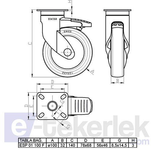 | ESP01 MBT 125 döner tablalı, plastik maşalı, termoplastik kauçuk kaplı tekerlekli, plastik kapaklı çift bilya yataklı ürünümüzdür. Tekerleğin yataklaması bilyalı rulman ile sağlanmıştır. Tekerlek göbeğinde hassas bilyalı rulman mevcuttur. Rulmanlı yataklama sayesinde darbelere karşı dayanıklı, kolay ve sessiz hareket etme kabiliyetine sahiptir. En ideal yataklama tipi olup uzun ömürlüdür ve bakım gerektirmez. Tekerlek, civata ve somun aracılığıyla oynak tabladaki 4 deliğe bağlantı yapılarak yüzeye montaj gerçekleştirilir. Tekerlek, oynak maşası sayesinde 360 derece dönebilme kabiliyetine sahiptir. Tablalı bağlantı en çok tercih edilen bağlantı tipidir. Termoplastik kauçuk kaplama sayesinde ürün sessiz bir sürüş sağlar. Aynı zamanda bu kaplama sayesinde estetik bir görüntü oluşur. Kullanıldığı zemine zarar vermeden çalışır, iz bırakmaz. Plastik maşa sayesinde hijyen sağlanır ve üründe kullanan metal parçalar minimuma indirgenmiş olur. Özellikle hastane karyola yatak ve medikal ekipman tekerleği olarak tercih edilen bu ürünümüz aynı zamana mobilya, mağaza ekipmanı ve temizlik ekipmanı tekerleği olarak da kullanılabilir. Darbe dayanımlı yüksek performanslı plastikten üretilmiş yan ve üst kapaklar. Ürün maşa aksamı: Plastik gövdeli maşa, gri (RAL 9002), çift bilya yataklı, döner başlık, perçinli teker aksı |