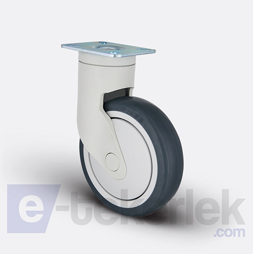 | ESP01 MBT 100 döner tablalı, plastik maşalı, termoplastik kauçuk kaplı tekerlekli, plastik kapaklı çift bilya yataklı ürünümüzdür. Tekerleğin yataklaması bilyalı rulman ile sağlanmıştır. Tekerlek göbeğinde hassas bilyalı rulman mevcuttur. Rulmanlı yataklama sayesinde darbelere karşı dayanıklı, kolay ve sessiz hareket etme kabiliyetine sahiptir. En ideal yataklama tipi olup uzun ömürlüdür ve bakım gerektirmez. Tekerlek, civata ve somun aracılığıyla oynak tabladaki 4 deliğe bağlantı yapılarak yüzeye montaj gerçekleştirilir. Tekerlek, oynak maşası sayesinde 360 derece dönebilme kabiliyetine sahiptir. Tablalı bağlantı en çok tercih edilen bağlantı tipidir. Termoplastik kauçuk kaplama sayesinde ürün sessiz bir sürüş sağlar. Aynı zamanda bu kaplama sayesinde estetik bir görüntü oluşur. Kullanıldığı zemine zarar vermeden çalışır, iz bırakmaz. Plastik maşa sayesinde hijyen sağlanır ve üründe kullanan metal parçalar minimuma indirgenmiş olur. Özellikle hastane karyola yatak ve medikal ekipman tekerleği olarak tercih edilen bu ürünümüz aynı zamana mobilya, mağaza ekipmanı ve temizlik ekipmanı tekerleği olarak da kullanılabilir. Darbe dayanımlı yüksek performanslı plastikten üretilmiş yan ve üst kapaklar. Ürün maşa aksamı: Plastik gövdeli maşa, gri (RAL 9002), çift bilya yataklı, döner başlık, perçinli teker aksı |