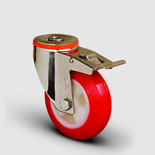 SSEM04ZKP80F Paslanmaz Delik Bağlantılı Frenli Poliüretan Tekerlek Çap:80 Inox Hafif Sanayi Tekerleği Burçlu Oynak Delik Bağlantılı Poliamid Üzeri Poliüretan Kaplı